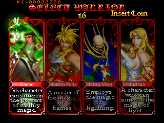 Cocco骑着袋鼠使用弓箭的家伙,土系魔法使用者.A 弓箭攻击↓+A 袋鼠尾巴攻击敌人→→+A 前冲攻击→→+B+A+↘ 空中下攻击←+A 背踢Lustro Furia少年剑客,擅长使用火系魔法A 挥剑→+A 刺击↓+A 扫腿→→+A 前冲攻击B+A 飞踢↓+B+A: 空中下刺→→+B+A+↓ 加速跳起下刺Lung Xing魔法师,电系魔法A 法杖攻击→→+A 前冲刺↓+A 下攻击→→+B+A+↓ 跳跃下刺攻击,法杖会释放电流,效果不错.→+A 前刺←+A 反刺Justicia女性光明魔法师,剑法不错.最主要人性感,,,动作很大胆,,很暴露A 挥剑→+A 刺击←+A 反踢腿→→A 飞腿↓+A 下攻击→→B+A 空中飞踢→→+B+A+↓ 加速下刺